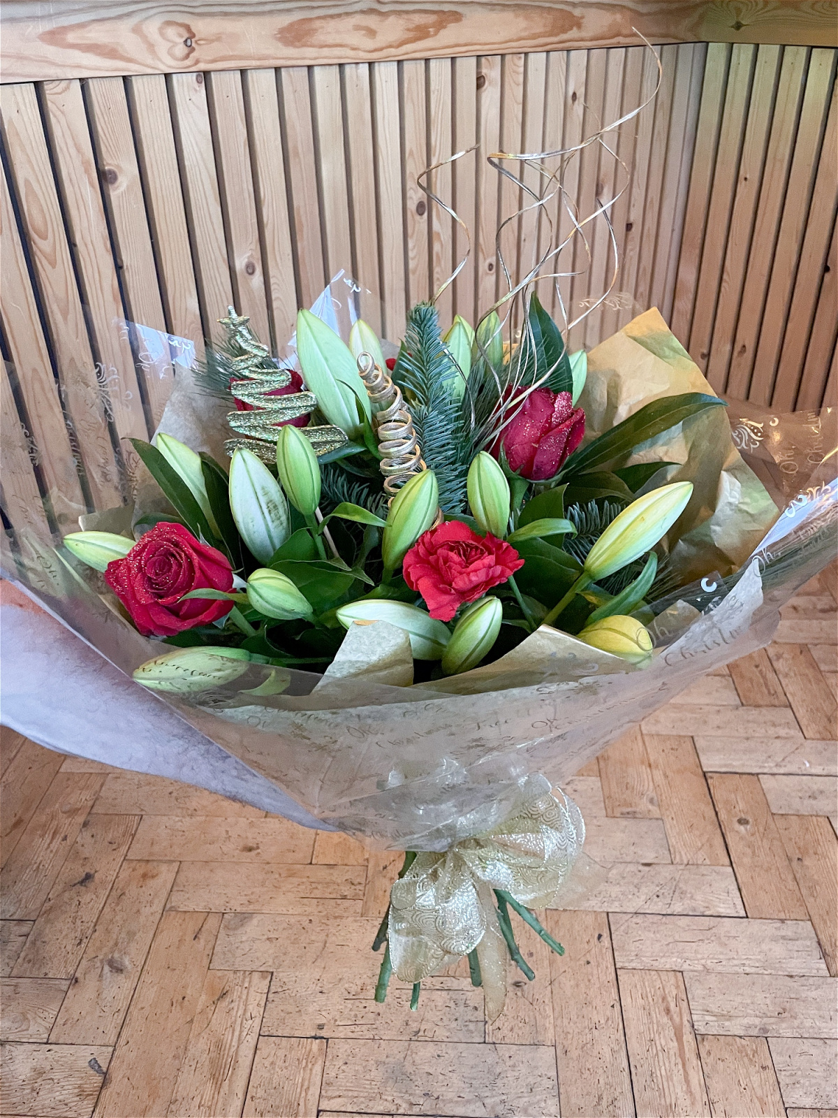 A Christmas hand-tie of fresh red flowers with a festive touch.