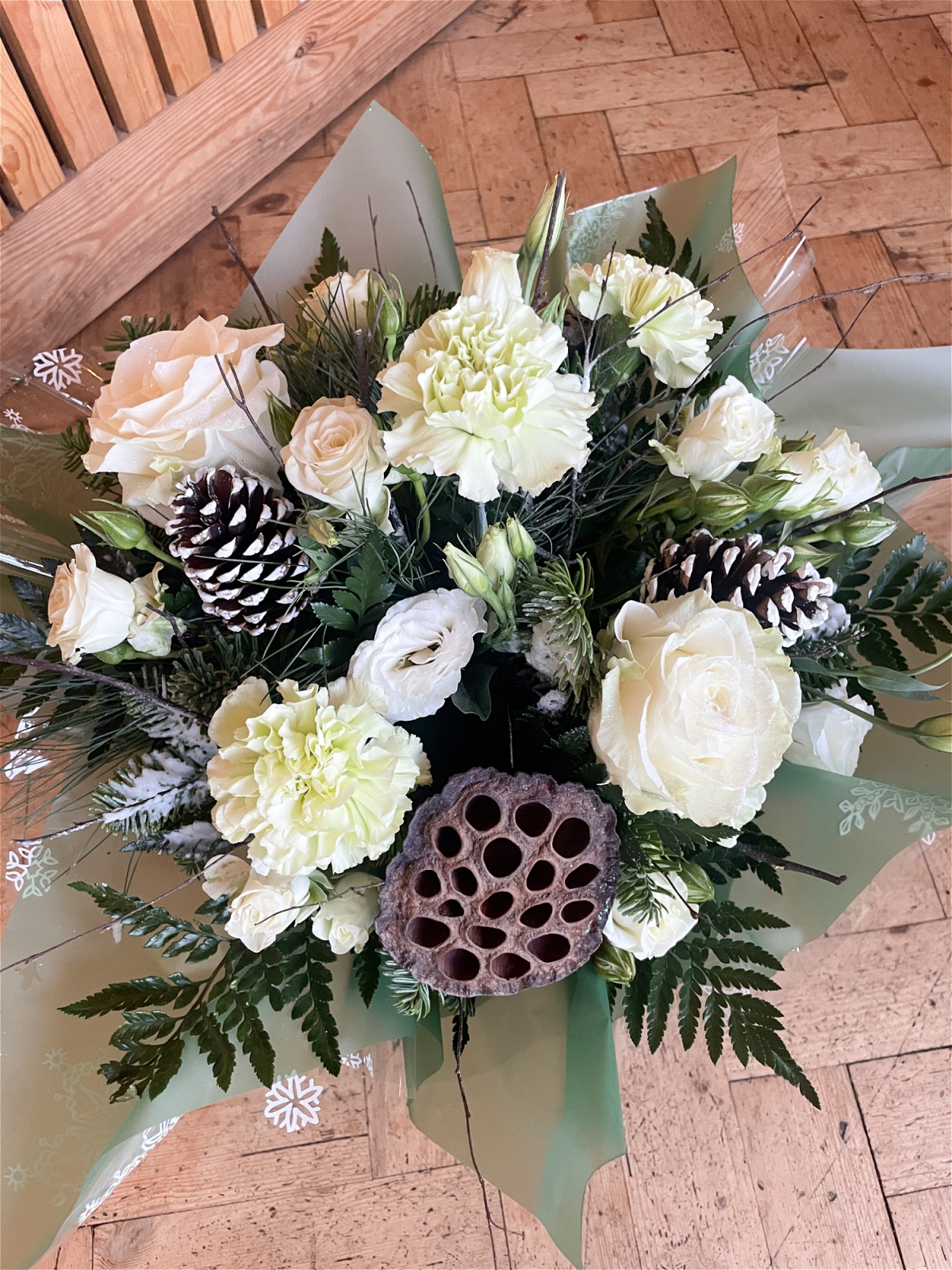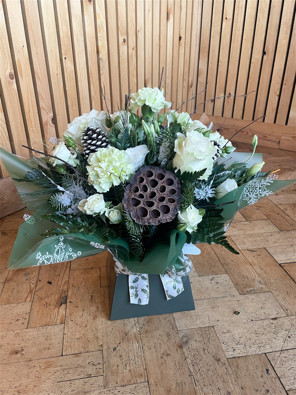 A selection of Christmas foliage and fresh flowers arranged in a gift box.